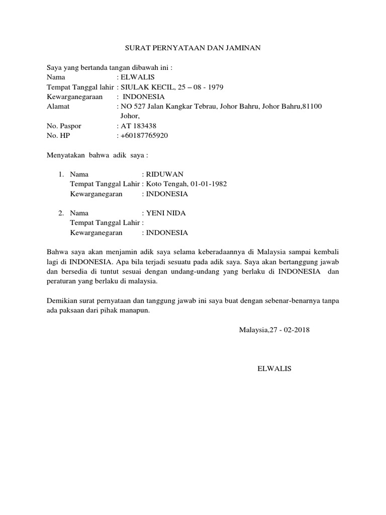 contoh surat jaminan untuk datang ke malaysia