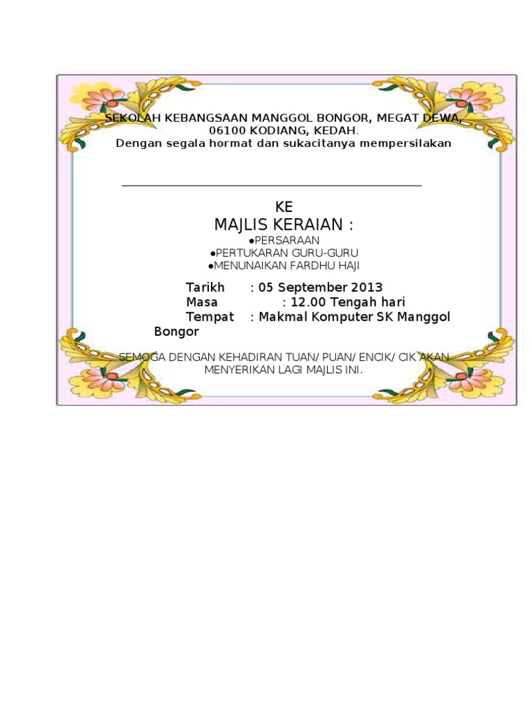 Interested in flipbooks about Kad Jemputan Majlis Persaraan. Moshims kad jemputan majlis perpisahan guru. Contoh Surat Jemputan Ke Majlis Perpisahan Guru It also will include a picture of a kind.